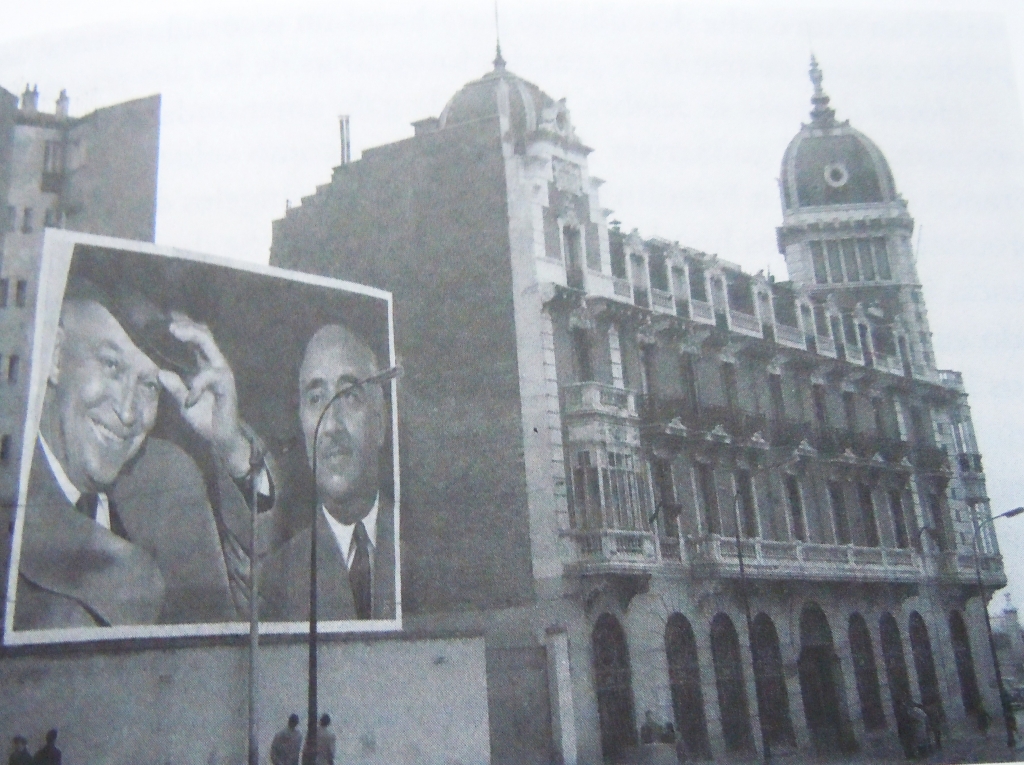 Otra muestra de como se vivió en Madrid los días previos a la visita, muchos murales con la foto de Franco y del Presidente americano adornaron la ciudad en una campaña de propaganda sin precedentes. Aquí una muestra, en la Plaza de España.