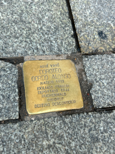 Hace días, caminando por Gran Vía, algo en el suelo llamó mi atención. Al leer el nombre lo primero que hice fue buscar en internet aquel misterioso nombre. Doroteo Gordo fue el portero de aquel edificio, ubicado en Gran Vía 9. Un día atravesó esta puerta para no regresar jamás a la que era su casa. Fue deportado a un campo de concentración y nunca más se supo qué pasó con él. Pero, ¿Qué era aquella placa dorada? ¿Quién la había puesto ahí?