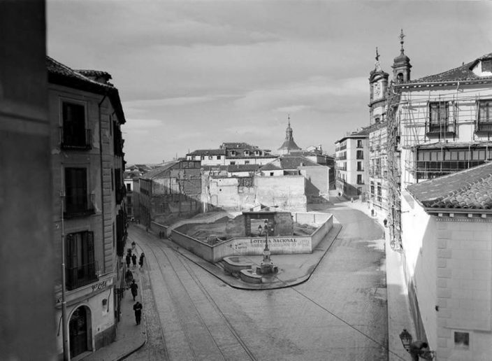 Al ser un lugar muy común de mis paseos por el viejo Madrid, me llamó mucho la atención encontrarme con esta fotografía de 1954 de este mismo lugar. Aunque con algunas diferencias, claro está, que para ello han pasado desde entonces tres cuartos de siglo. La primera y más evidente es que el bloque de casas que tanto me gusta, era entonces un solar sin demasiado atractivo con un anuncio de la Lotería Nacional.  A mano izquierda, vemos iniciarse la pendiente de la calle de Segovia, marcada con las vías del tranvía. Lo que se mantiene intacto desde entonces son las mínimas aceras que obligan a los viandantes a pegarse, codo con codo, con las fachada. Al otro lado,vemos la calle de San Justo y numerosos andamios en el Palacio Episcopal. Trabajos que parecen prolongarse hasta la Basílica de San Miguel.