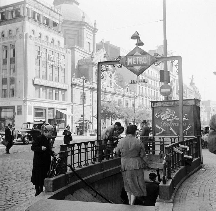Nos ubicamos esta vez en la Calle de Alcalá. Nos lo “chiva” la estación de Metro de Sevilla y también, esa iglesia de las Calatravas que, trata de pasar desapercibida sin su rojizo habitual de la fachada en este recuerdo en blancos y grises. La boca del metro es, sin quererlo, el eje central de esta escena urbana. Donde unos chicos parecen esperar a alguien recostados sobre la barandilla. Donde una señora mayor duda acerca de descender o permanecer sobre la superficie. Donde una enigmática mujer da buena cuenta de los gastados peldaños que le transportan a ese universo tan curioso como imprevisible que son las, por momentos infinitas, galerías del Metro.