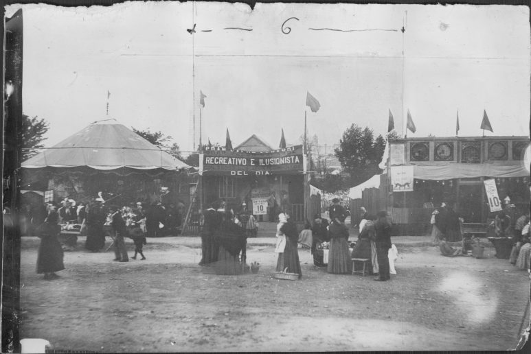 Esta costumbrista escena tomada en mayo de 1899 nos sumerge por completo en el ambiente de la pradera de San Isidro durante los festejos de aquel año. Vendedoras ambulantes, muchas mantillas y varios puestos de ferias entre los que destaca el ‘Recretativo e ilusionista con todos los acontecimientos del día’. Atracción que podía disfrutar el público previo pago de 10 céntimos. ¿A quién no le gustaría darse un paseo dentro de esta imagen?