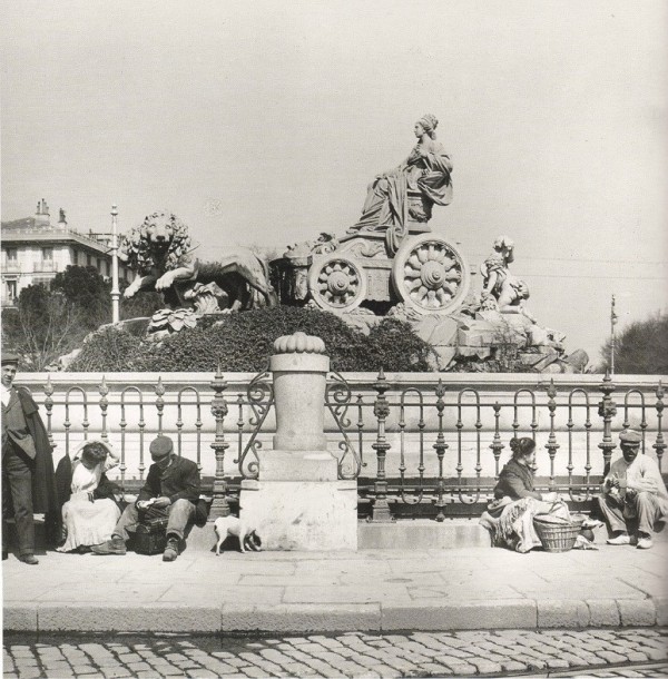 Dos parejas de aspecto y vestimenta sencillas parecen hacer un alto en el camino en sus quehaceres diarios para reponer fuerzas. Para ello no eligen un lugar cualquiera sino que optan por descansar y charlar tranquilamente a los pies de Cibeles, una Diosa que como vemos, hace años, se mostraba mucho más terrenal y accesible que en la actualidad, custodiada y “protegida” por un continuo anillo de tráfico.