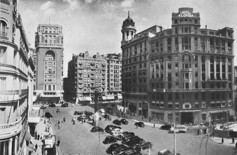 Sé que en estos viajes que acostumbramos a dar en el tiempo cada martes, ya nos hemos desplazado en varias ocasiones hasta la Plaza de Callao, un escenario que nos sorprende siempre con sus mil y una caras. En esta ocasión me he vuelto a decantar por este lugar porque en la imagen de hoy aparece un viejo amigo, el Hotel Florida, un conocido al que tenía muchas ganas de mostraros por aquí.