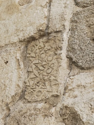 En la pared que se ve la cartela que indica el nombre de la ‘Travesía del Biombo’ hay a su lado una vetusta ventana con barrotes de hierro, pues en su esquina inferior derecha veréis el misterioso sillar del que os estoy hablando. Varias letras un tanto abigarradas e ilegibles pero ¿Qué hacen ahí? Todo apunta a que esta piedra perteneció originalmente a una lápida sepulcral que se reutilizo en la reforma de la iglesia del Siglo XV, lo que nos da una fecha aproximada de la antigüedad de esta inscripción.