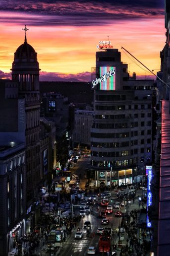 Lo bueno de estos días tan vagos es que las noches nos abrazan antes y nos pillan con los ojos bien abiertos, cuando se producen momentos como éste. Fue en un viernes, en una tarde de noviembre, cuando las manecillas acababan de marcar las seis y media de la tarde. Cuando el jaleo de la Gran Vía se detuvo por unas décimas de segundo, precisamente, cuando la cámara se disparó. Todo lo que era un movimiento aleatorio se detuvo por un instante y entonces, ocurrió esto.