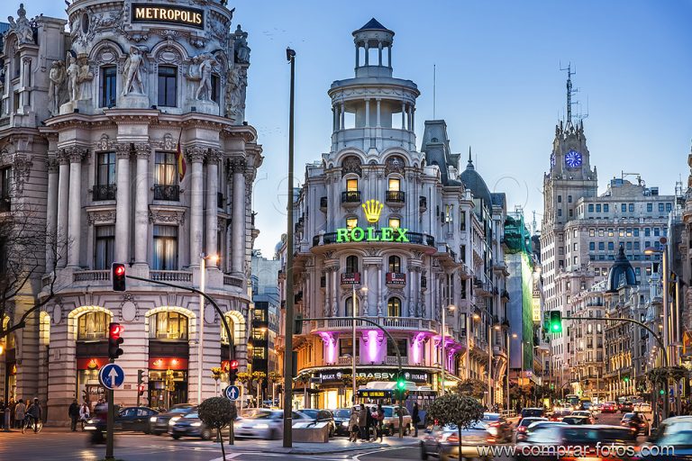 De sus muchas fotografías he querido compartir la que quizás sea la mirada más evocadora y repetida de Madrid, ese comienzo de la Gran Vía espoleado por dos iconos como el Edificio Metrópolis y el Edificio Grassy. Un tramo en el que los neones de los comercios se funden con los faros de los coches provocando a ras de suelo un perenne río de luz. Un espectáculo que parece perder fuerza según avanzamos en altura, cuando los edificios y el cielo de Madrid confían en su desnudez como su mejor arma para robar nuestra atención.