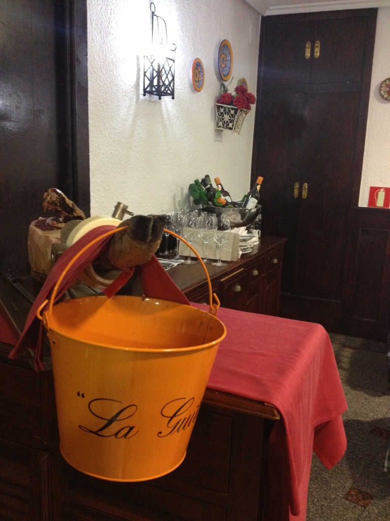 De la carta qué os voy a decir…. Encontramos todos esos sabores que nos evocan a Andalucía de manera inmediata, ‘pescaíto frito’ como los calamares, los boquerones o la fritura, además de otros productos del mar como gambas, almejas, navajas o berberechos. Mucho donde elegir, una pena que al final, uno sólo pueda probar un par de platos. En mi caso, después de un riquísimo aperitivo en forma de platito de alubias me pedí media ración de chopitos y media de navajas, ambas muy ricas, especialmente las navajas. Para finalizar el festín, y como uno es un carnívoro nato, opté por un lomo de buey trinchado, que me sirvieron sobre una plancha para que yo lo cocinase a mi gusto… ¡Espectacular!